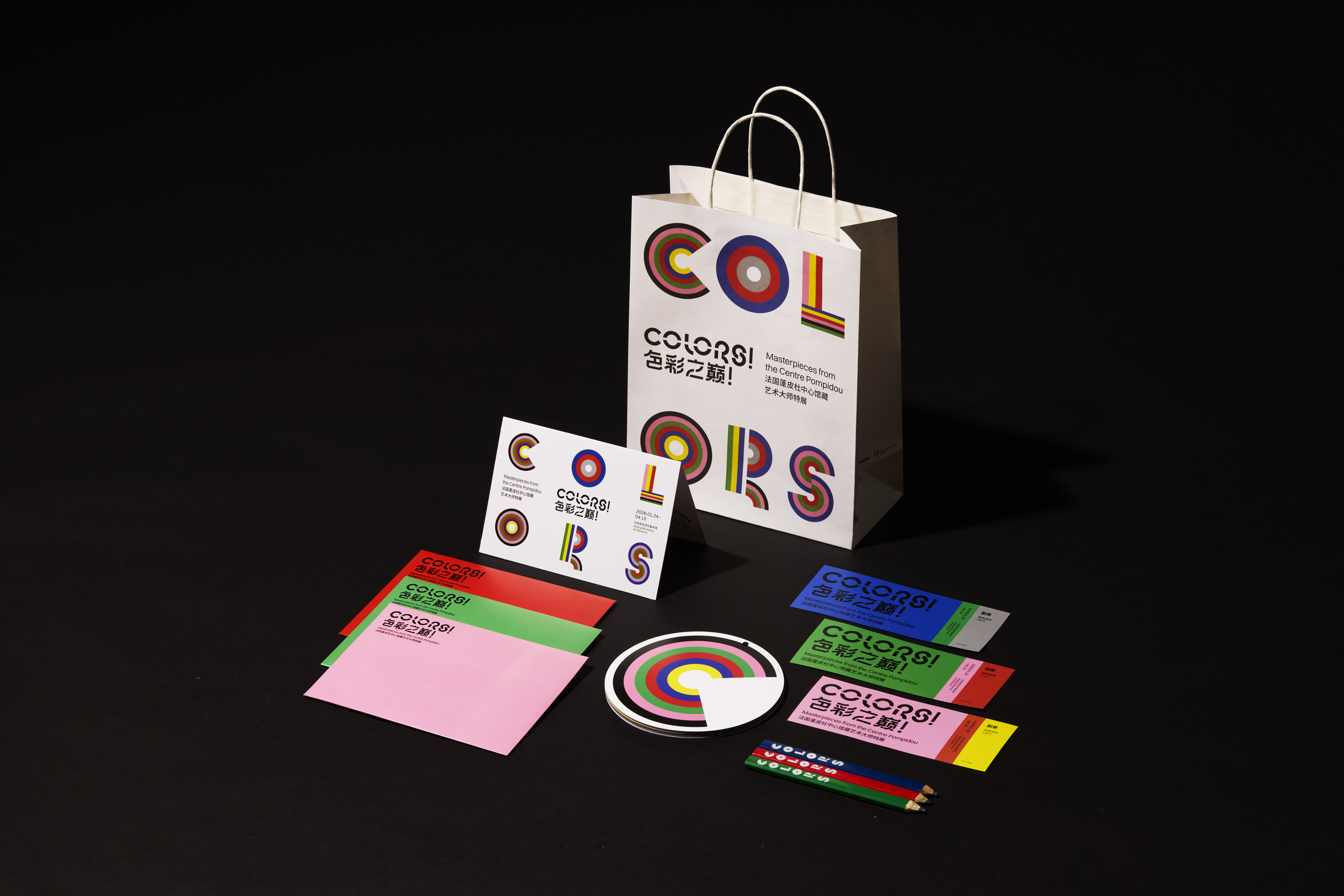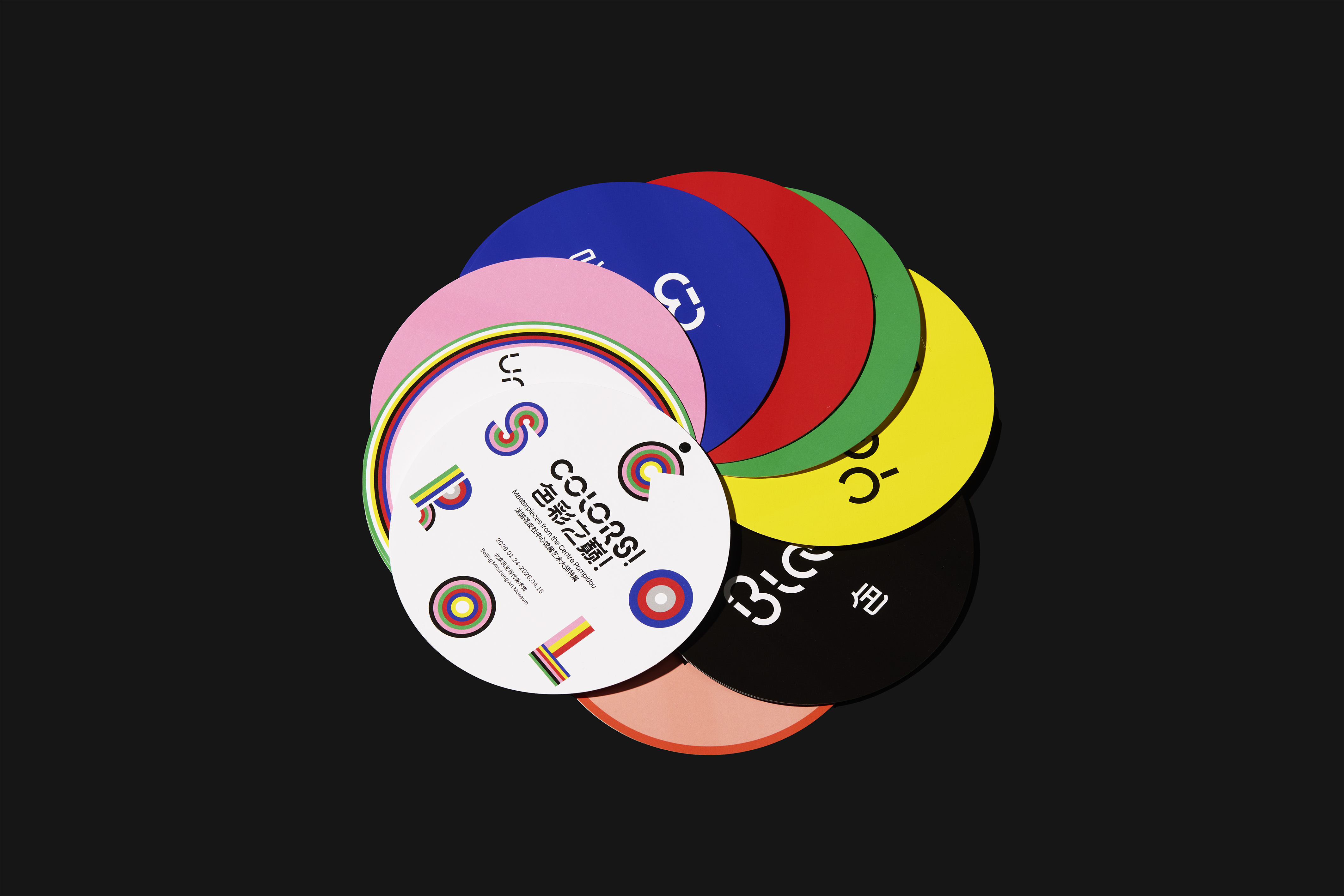 Visual identity design for the exhibition “COLORS! Masterpieces from the Centre Pompidou”, which explores modern art through seven colors: blue, red, pink, yellow, white, black and green. We transformed the colorful stripes into the letters of “colors” arranged in circular shapes to match the exhibition design.